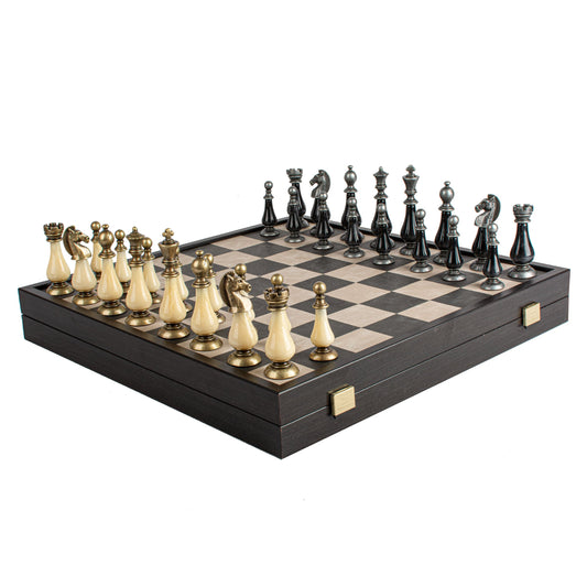 Black/White Leather Chessboard - 50x50cm with Brass and Pewter Finish Chessmen & Pearl Elements